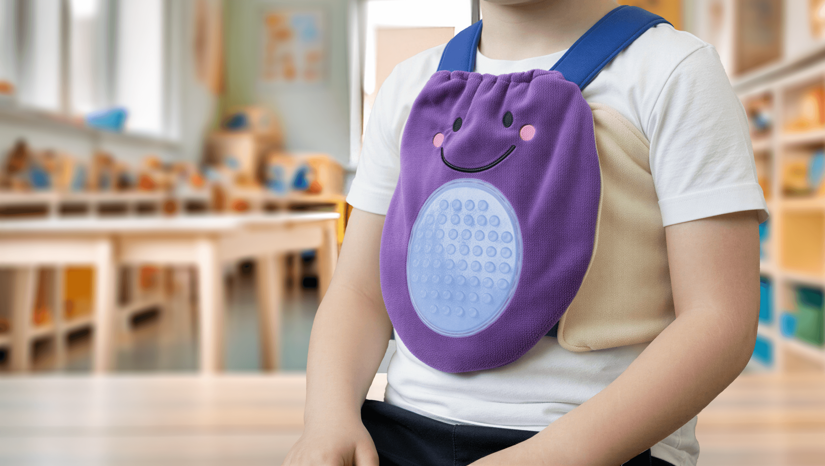 Tightens up around the torso to provide gentle vibrations, while also providing tactile input through a